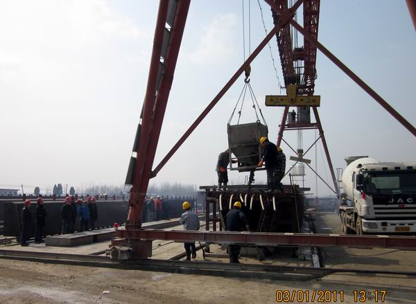 為確保此次箱梁澆筑過程萬無一失,項目部精心制定澆筑施工方案,提前做好各項準(zhǔn)備工作。項目部對澆筑設(shè)備及混凝土進(jìn)行反復(fù)檢驗,制定應(yīng)急預(yù)案,要求全體人員在澆筑過程中樹立高度的責(zé)任心,保證整個澆筑過程安全、有序。隨著砼灌車進(jìn)入梁場,試吊、起吊、前移、就位、澆筑,一串協(xié)調(diào)而又連貫的運作之后,第一片箱梁成功澆筑。