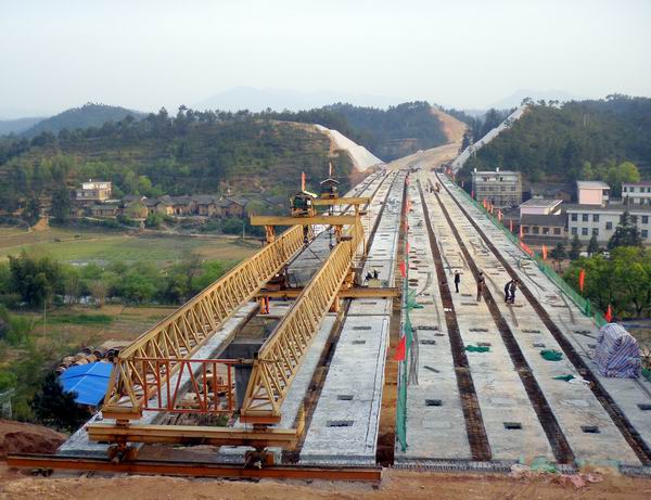 站塘大橋的中心樁號為K1497+532,全長306米,共12跨,是我標(biāo)段最長的一座大橋。上部構(gòu)造為25米預(yù)應(yīng)力箱梁,共96片,下部結(jié)構(gòu)共有樁基52根、蓋梁26片。站塘大橋的梁板是從2號梁場運(yùn)過來的。在運(yùn)梁過程中,由于遇到連陰雨天氣,導(dǎo)致道路潮濕,不能承受梁板的重量。針對這種情況,項(xiàng)目部積極開拓思路想辦法,不等不靠,通過用碎沙石鋪出一條道路來保證運(yùn)梁不受影響。在春節(jié)復(fù)工后,項(xiàng)目部又加大人力物力投入。架梁過程中,橋梁技術(shù)人員始終堅守在施工一線,做好分部分項(xiàng)技術(shù)交底和安全防護(hù)工作,保證了架梁的進(jìn)度、質(zhì)量和安全。