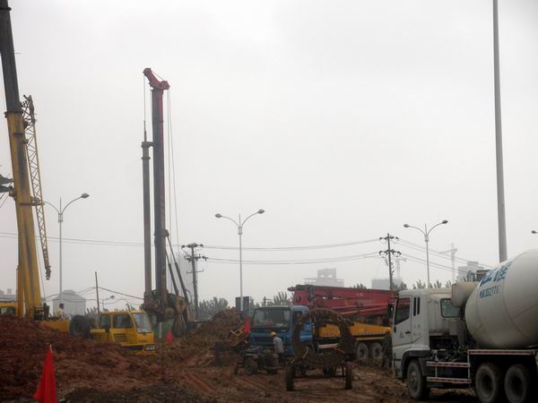 目前,項(xiàng)目部已具備辦公條件,主要管理人員已基本到位,道排、橋梁、樁基、擋墻等施工隊(duì)伍已進(jìn)場施工,并于7月5日,完成首根樁基的澆筑。項(xiàng)目部在人員不足,桿管線、污水燃?xì)夤艿厘e(cuò)綜復(fù)雜等不利因素的影響下,利用現(xiàn)有條件充分挖掘工作面。截止7月17日,已完成駐地建設(shè),懷寧路下穿橋支護(hù)咬合樁33根、下穿橋樁基28根,翡翠路上跨橋鉆孔樁22根,棄土方14600方、溝槽開挖2840方,回填2180方,雨污水管道埋設(shè)約730米,累計(jì)完成產(chǎn)值約1000萬元。